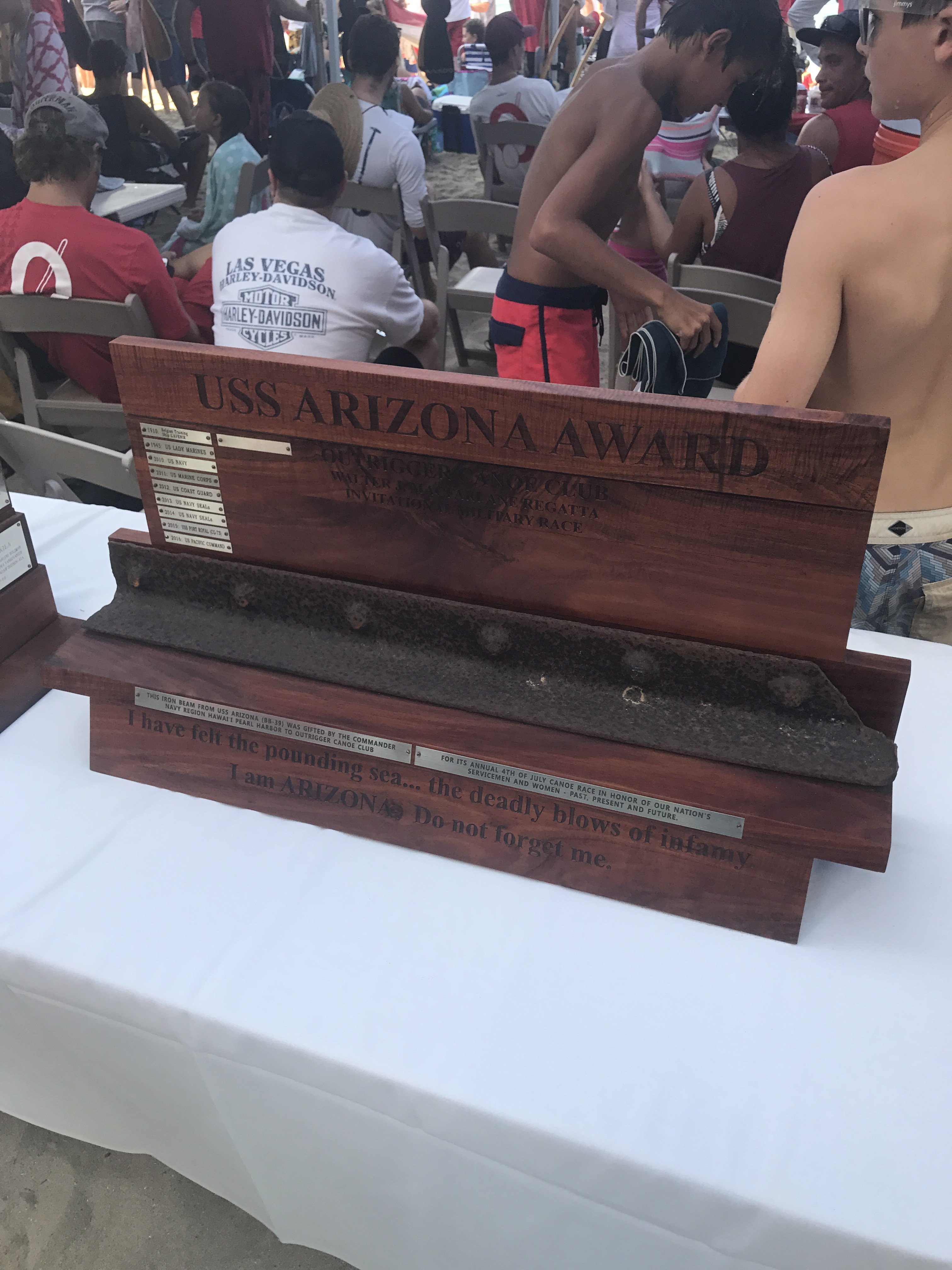 After a leisurely morning in the condo, Mike and I headed out on a walk along the beach to check out all the action of the holiday — we had already been counting the number of tents that were set up before dawn — ensuring their prime viewing spots for the fireworks tonight. Little did we know we would round a bend and come upon a gorgeous site of a beach crowded with people, tents, oars, and outrigger canoes. Their annual Fourth of July Outrigger Canoe Race was already underway right under our nose and we had had no idea! (Outriggers are a type of very long canoe with one or more lateral supports and are an important part of the Polynesian culture, raced in Hawaii, Tahiti, and Samoa.)