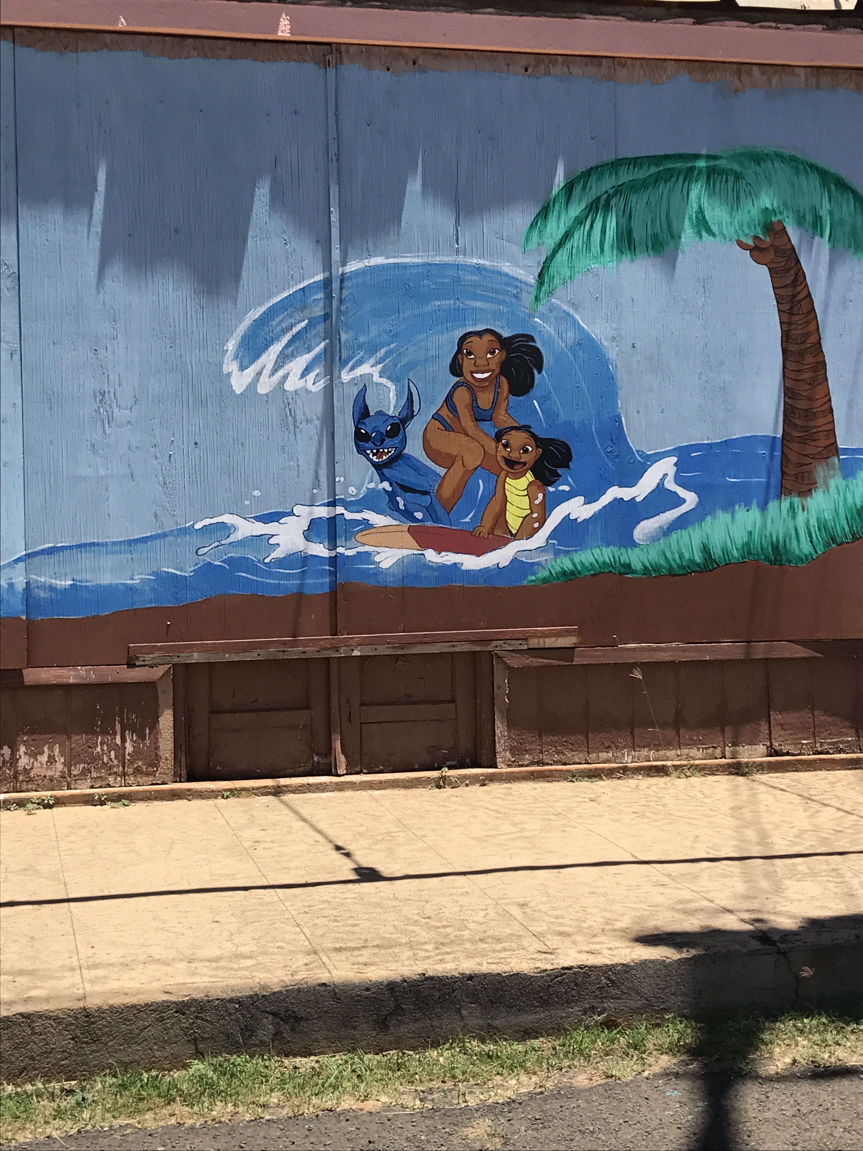 Then, we rode through the town of Hanapepe just to show Casey this cute mural painted on the side of a building, since she does have a thing for Lilo and Stitch, on our way to Waimea for lunch.