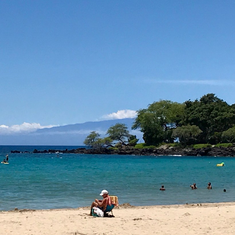 But then we drove up the beautiful Hamakua Coast, through my favorite little town (Waimea) and back down along the Kohala Coast to kill time before our flight back to Honolulu. The famous Hamakua Coast did not disappoint, with its deep valleys and fragrant eucalyptus forests, but we decided not to stop for pictures in the rain, for reasons mentioned above. As Michael drove, we all watched the sky turn from rainy and dreary in the east, to foggy in the north, to finally, blue skies and sun in the west. It was glorious. And I remembered again how much I love the Kohala area. We killed an hour at the Waimea Farmers Market one last time, then watched the clouds disappear behind us as we descended down the other side of the mountain. As we headed south to Kona, the beautiful blue sky seemed to melt into the also beautiful blue Pacific. Stopping at one of the prettiest beaches on the island and the sight of our Manta Ray Snorkel on Day 20, we took in the sun and sand of Mauna Kea Beach for just a few minutes and I secretly envied all the beachcombers.