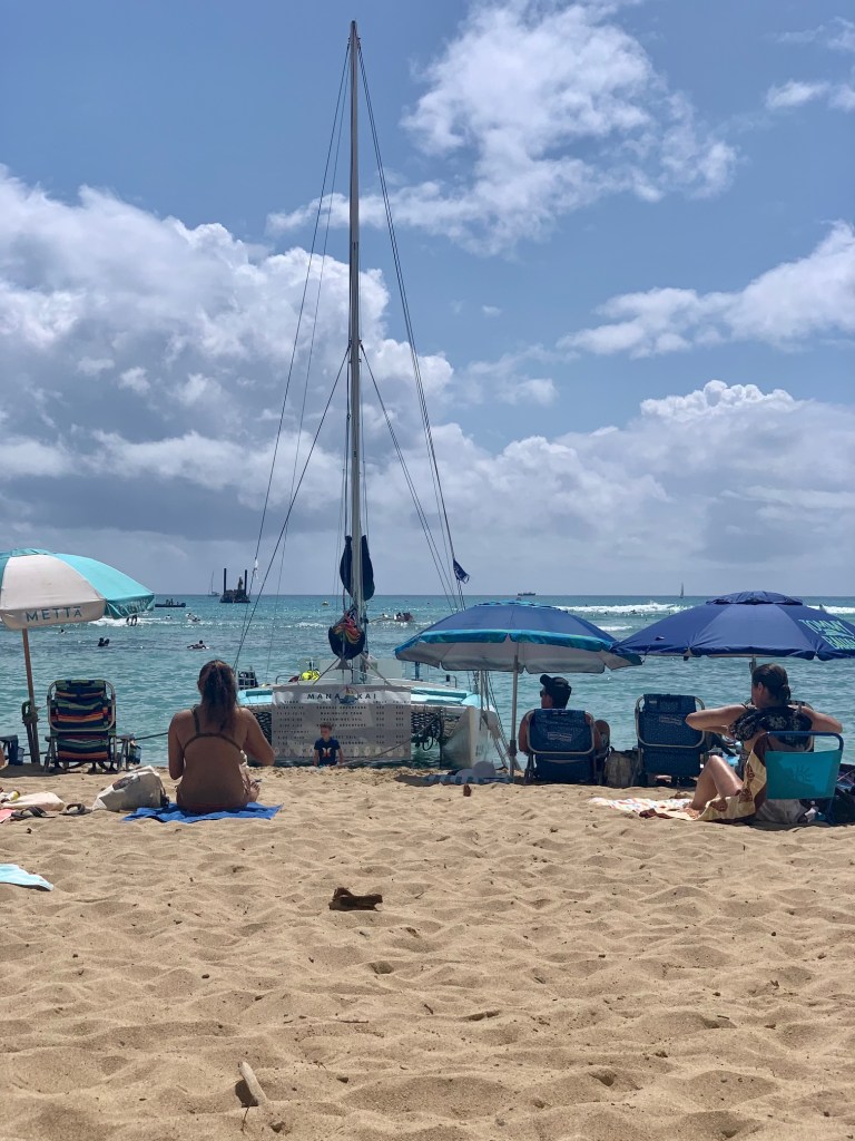 We decided to enjoy the beach below us on Waikiki but first stopped at a cute coffee shop that had delicious club sandwiches. While eating, we witnessed an older gentleman get caught for stealing some RipCurl swim trunks from the store next door. (Like, walked out carrying the wood hanger and everything!) It was quite the commotion and I am not sure who I felt more sorry for… the old man who clearly had some issues or the frustrated young sales woman coming after him!
