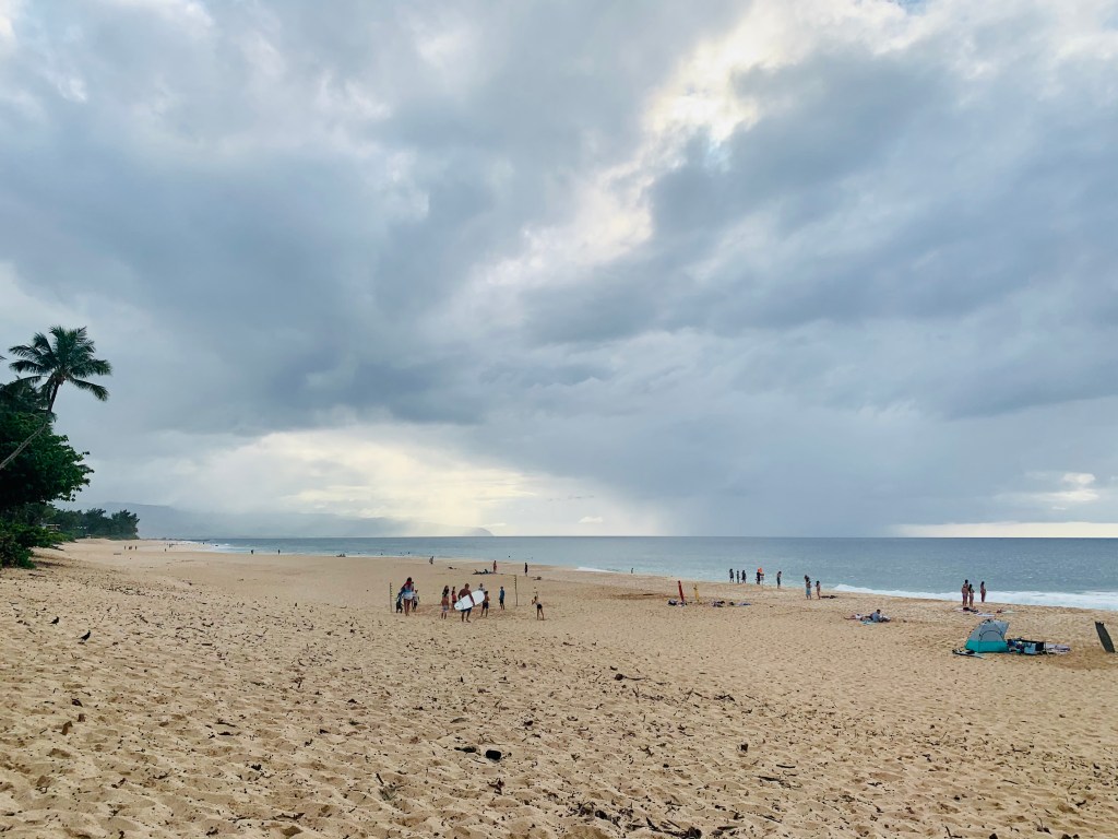 We left Waikiki Beach around 1 in the afternoon and didn’t even bother to wash the sand off our feet before jumping in the car and heading up to Haleiwa which is an adorable town on the North Shore of Oahu. The hour long drive was totally worth seeing the waves crash on the very sloped beach and the experienced surfers handle these waves. Dan even tried to jump in and body surf a bit but didn’t last too long. This beach was big and gorgeous with views of the northwestern tip of the island and beautiful storms off in the distance. It’s famous for the gigantic waves that produce some of the best and most famous surfing competitions in the world. In fact, back in January, Dan witnessed some of the biggest waves in 20 years on this very beach.