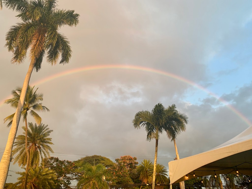 By 5:45 we were both getting hungry so we travelled back toward town and got a perfect table under a tent at Haleiwa Joe’s, a local restaurant that turned into a gem of a find for us. Great service, fantastic food, and a gorgeous rainbow on one side and peaceful sunset on the other. It was such a fun way to end such a wonderful day.