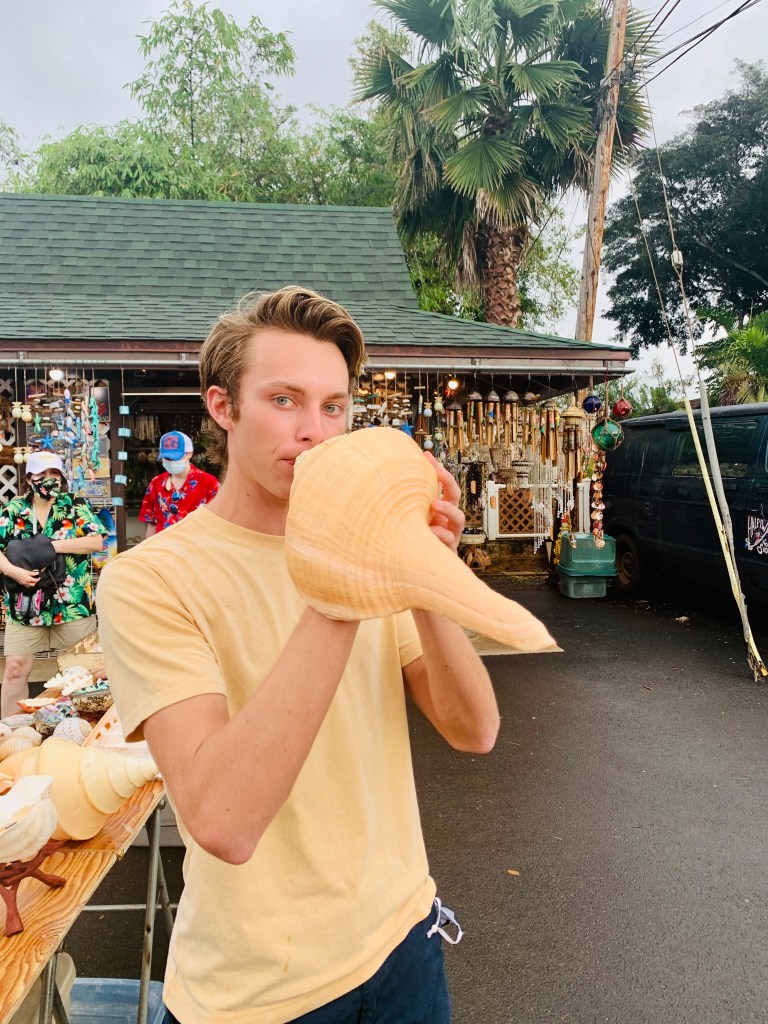 With the weather continuing to keep us in suspense, we hopped back in the car and drove back up to Haleiwa for some shopping. Besides the famous surfing beach, lots of cute shops, boutiques, and restaurants make this adorable town quite popular among the locals and the tourists. The only purchase of note today was a beautiful Horn Helmet Shell that has been cut for the purpose of blowing. The salesperson was kind and knowledgeable and helped Dan pick out just the right one. Ever since the very first time Dan visited Hawai’i (he was all of 5 years old and just as cute as a button) Dan has been fascinated with making sounds from shells, especially after witnessing Hawaiians blow the Pu in certain ceremonies or at sunset to mark the end of the day. Hawaiians and other Pacific Islanders consider the blowing of Pu (a conch shell) a deep part of the Hawaiian culture. (In fact, you can read about the blowing of Pu here.) He was so happy to get it (his 7 years of playing trumpet contributed to his natural ability — it really does take some skill). But, as soon as we got in the car he started worrying that it would be disrespectful to Hawaiians for him to be blowing the Pu (or in this case a Horn Helmet shell). This worry led to the reading of articles and a healthy discussion about cultural appropriation the entire hour long drive back to Waikiki. We didn’t land on any answers or solutions by the time we made our way back to the condo but it was a great discussion none the less.